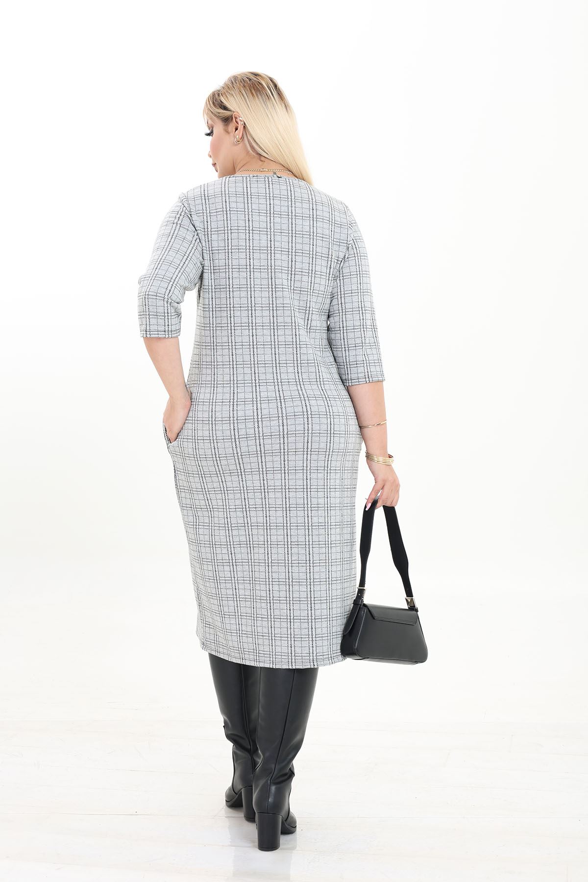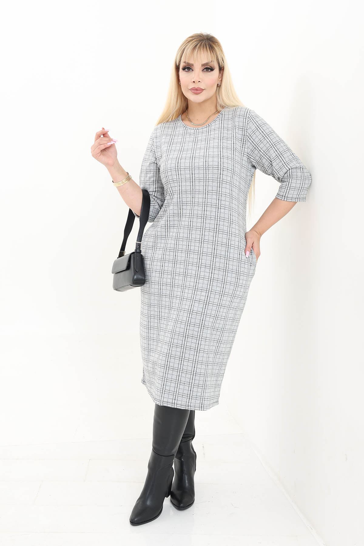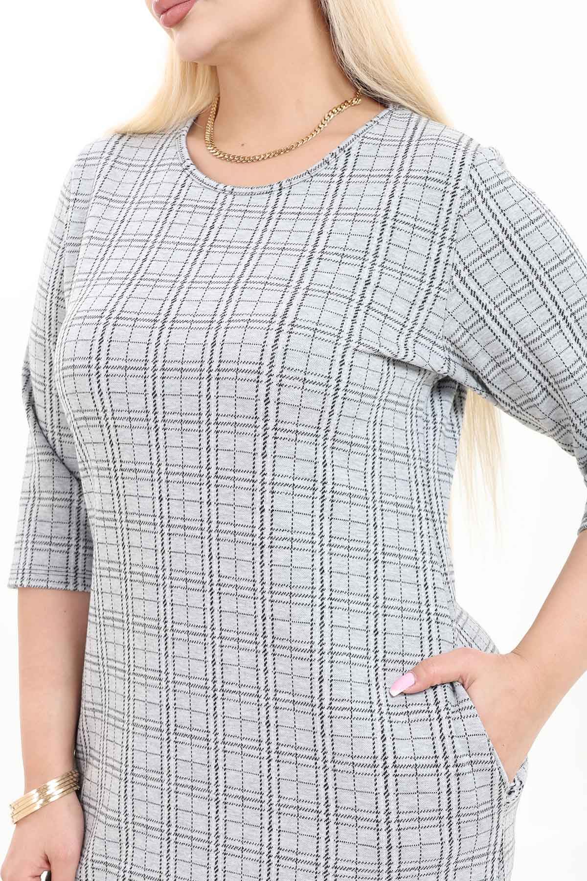 Çift Cepli Desenli Esnek Kışlık Büyük Beden Midi Elbise 4D-2737
