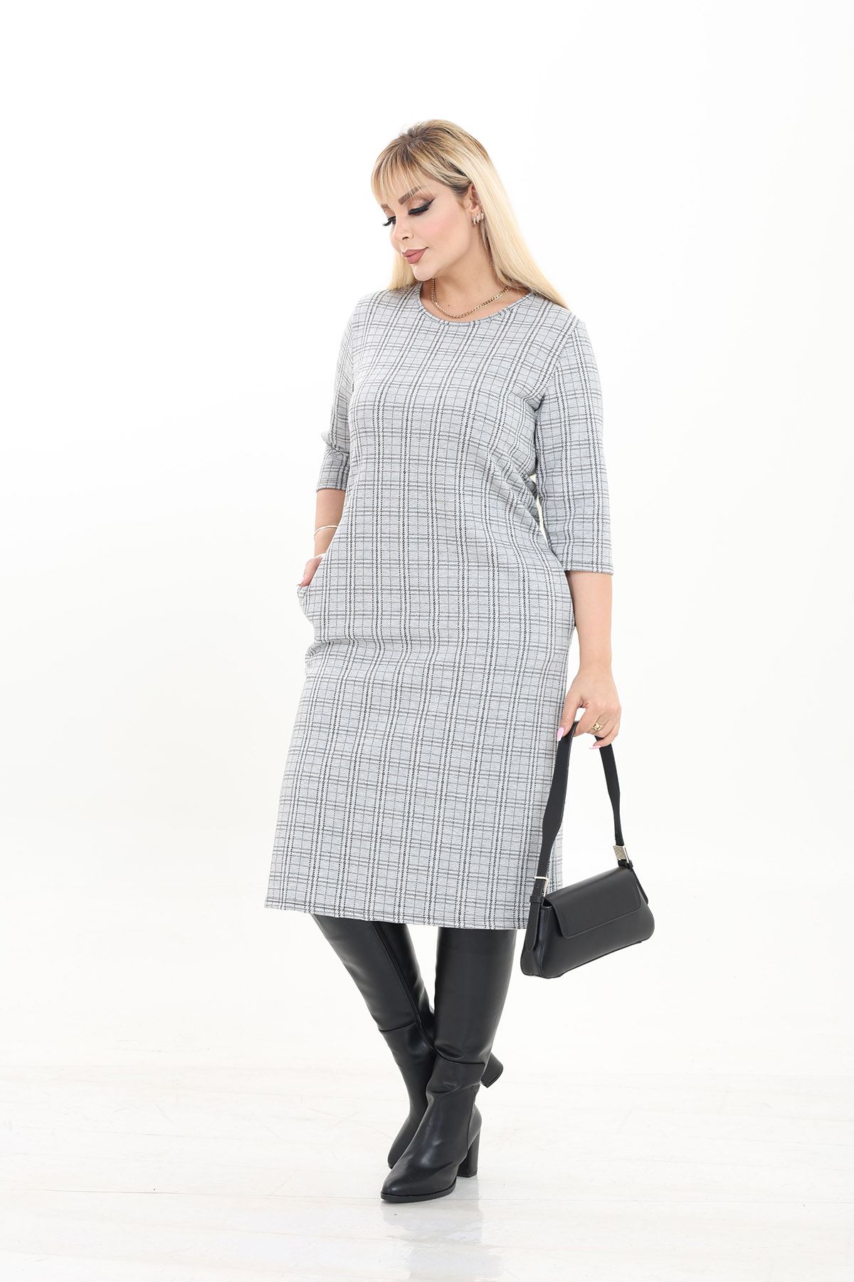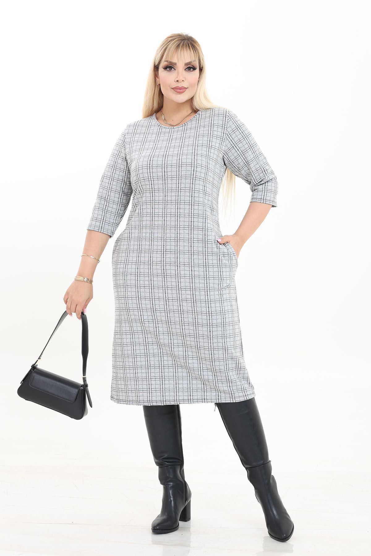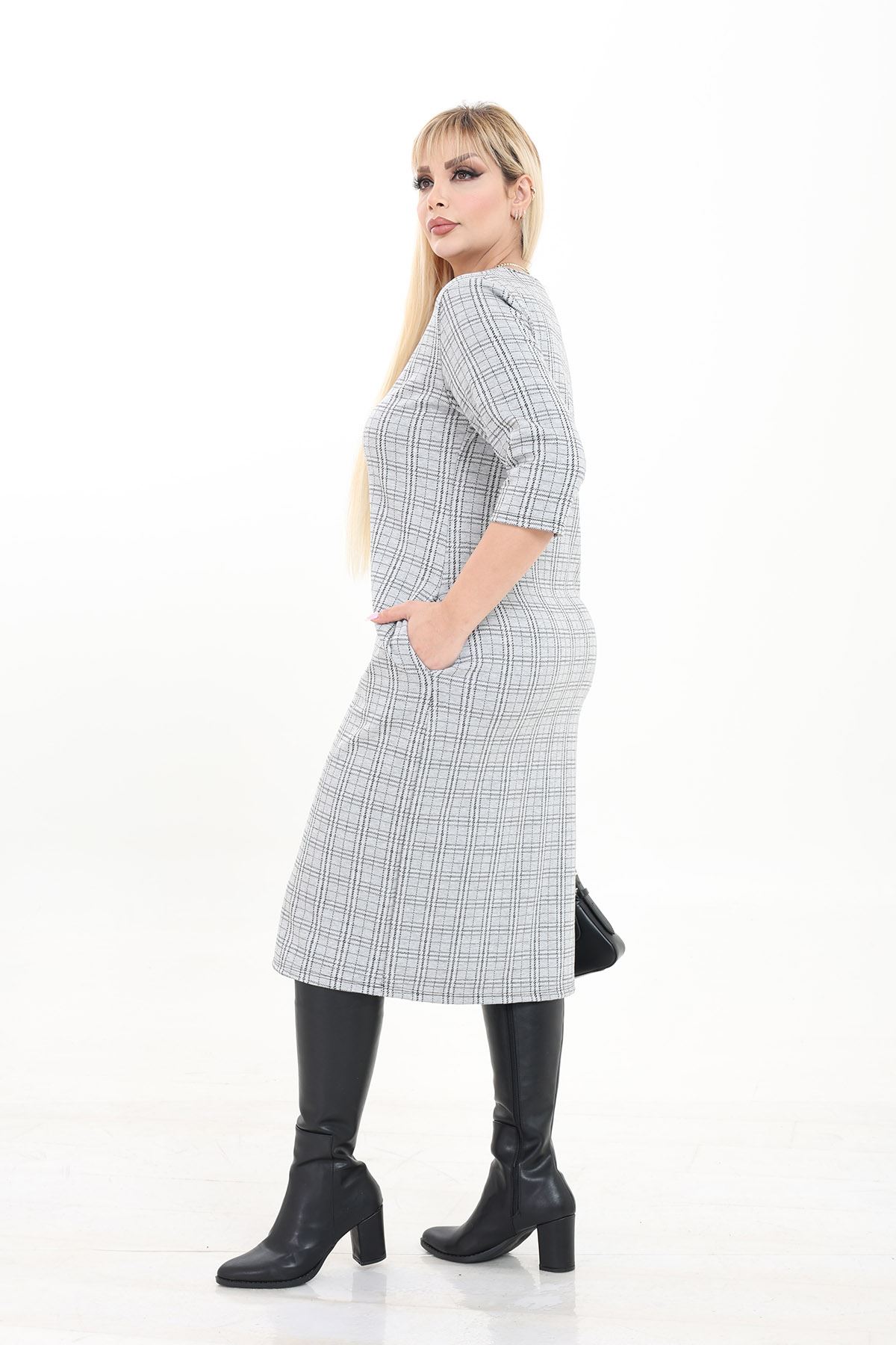 Çift Cepli Desenli Esnek Kışlık Büyük Beden Midi Elbise 4D-2737