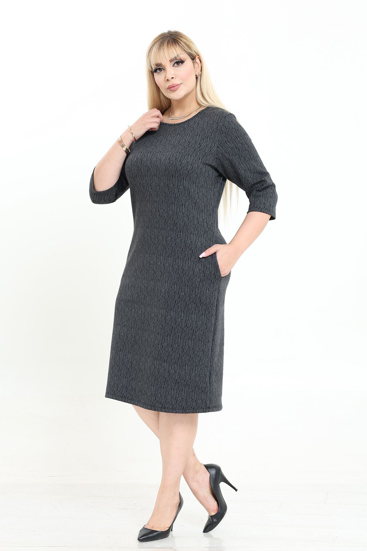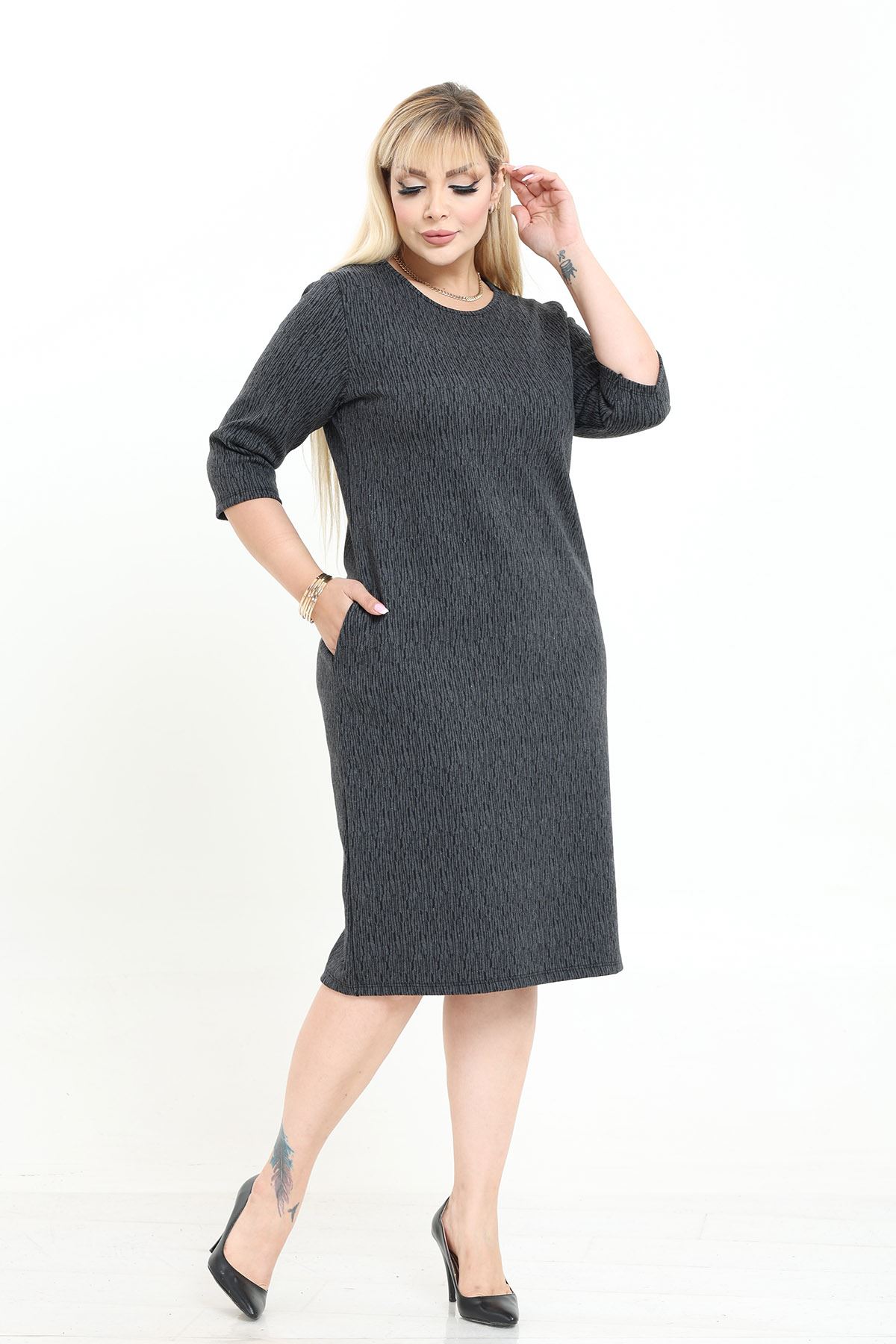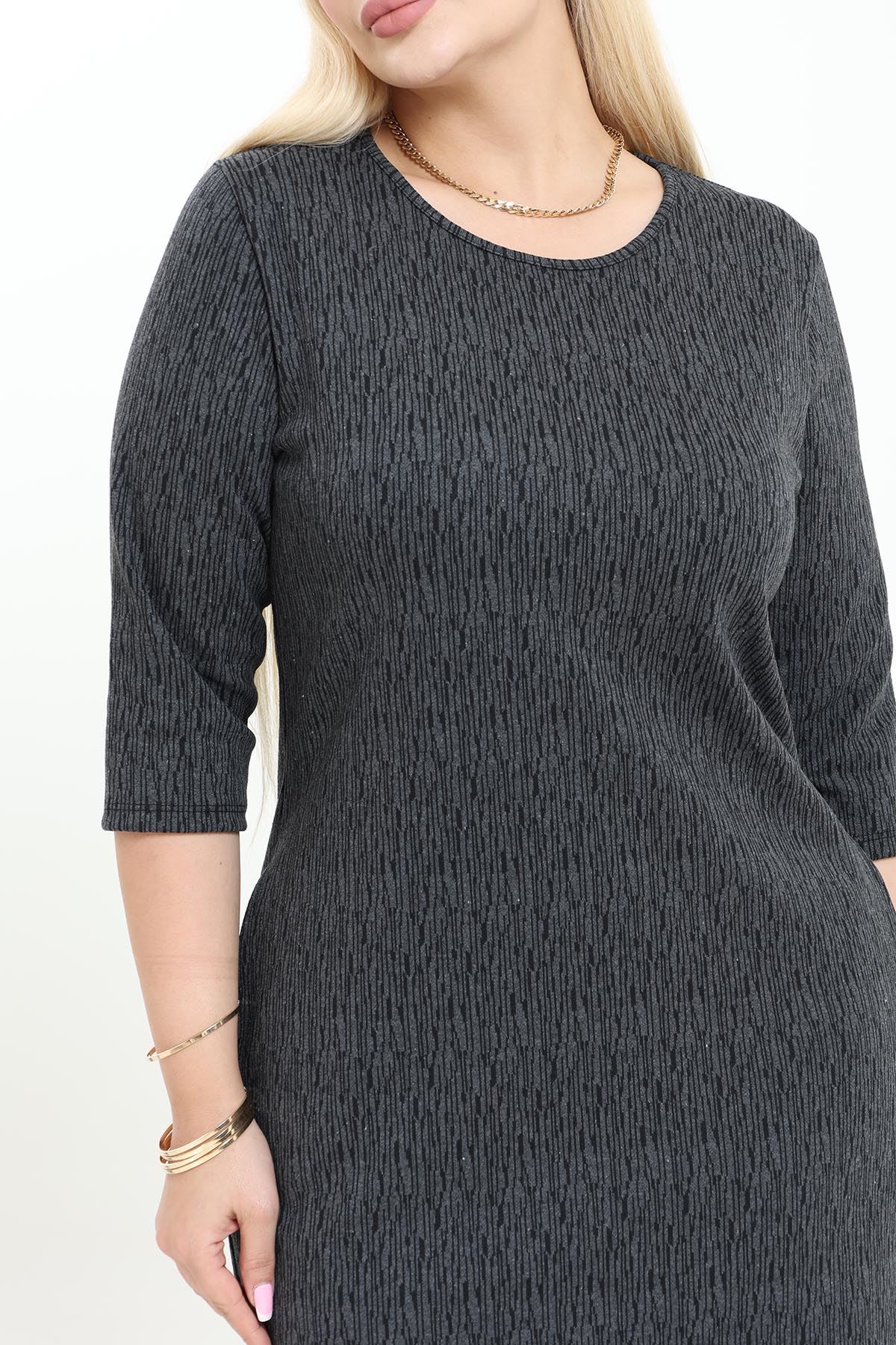 Çift Cepli Desenli Esnek Kışlık Büyük Beden Midi Elbise 27A-2740
