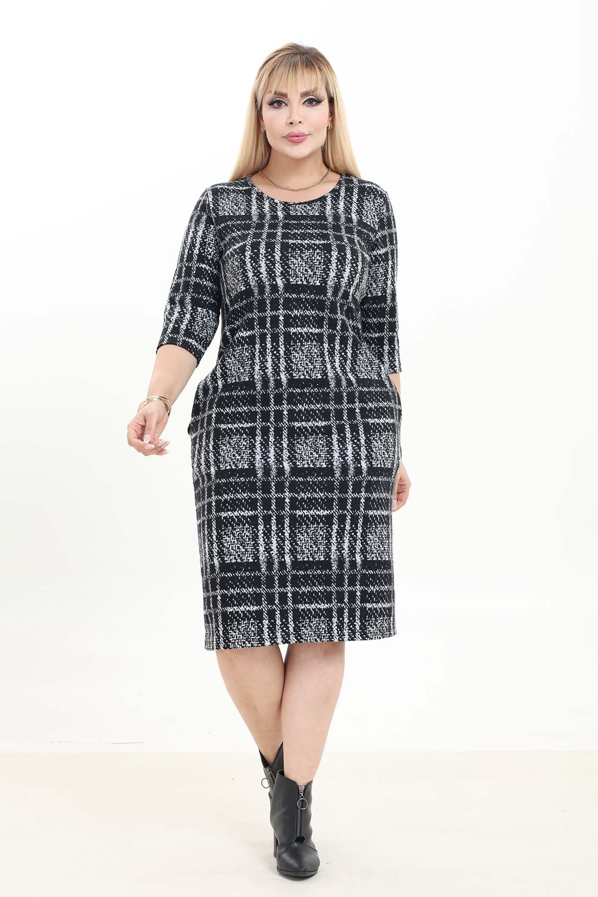 Çift Cepli Desenli Esnek Kışlık Büyük Beden Midi Elbise 37D-2741