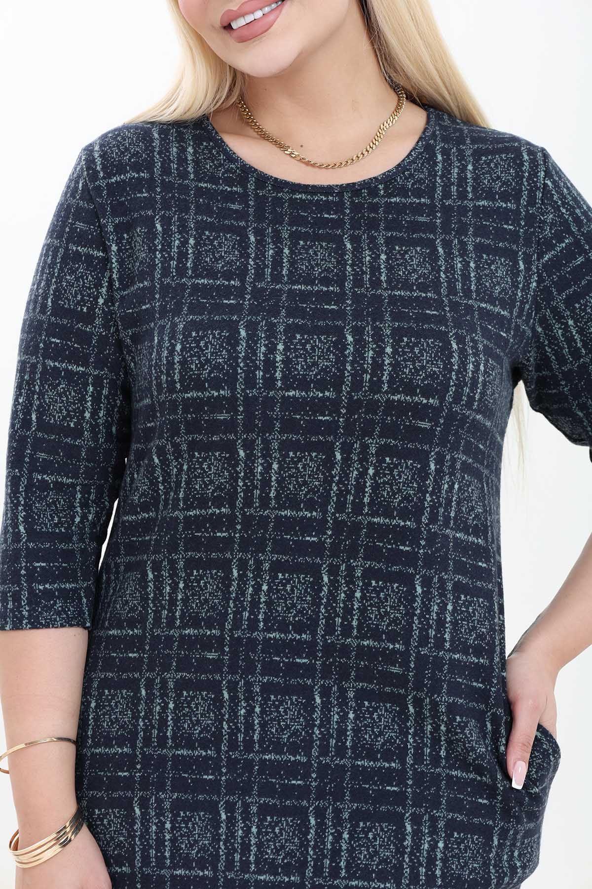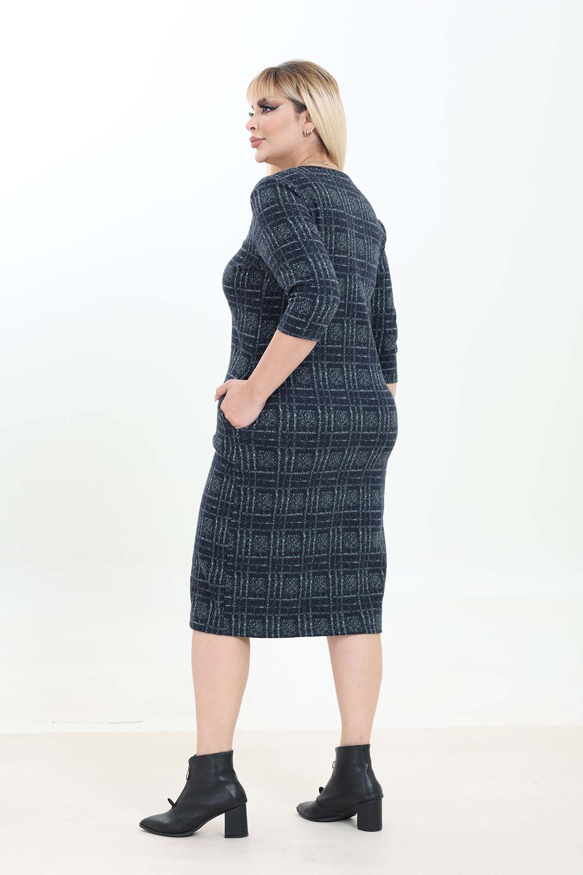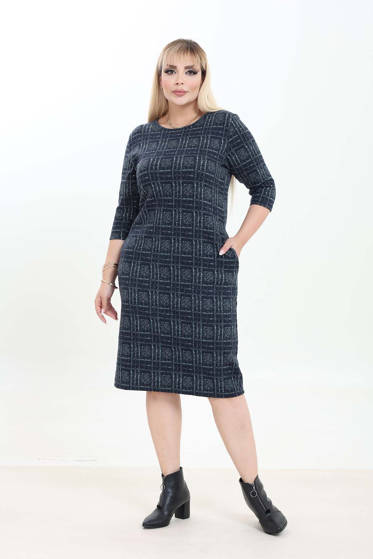Çift Cepli Desenli Esnek Kışlık Büyük Beden Midi Elbise 21A-2760
