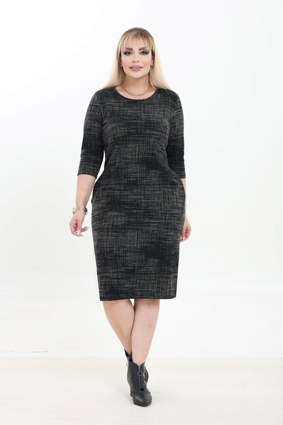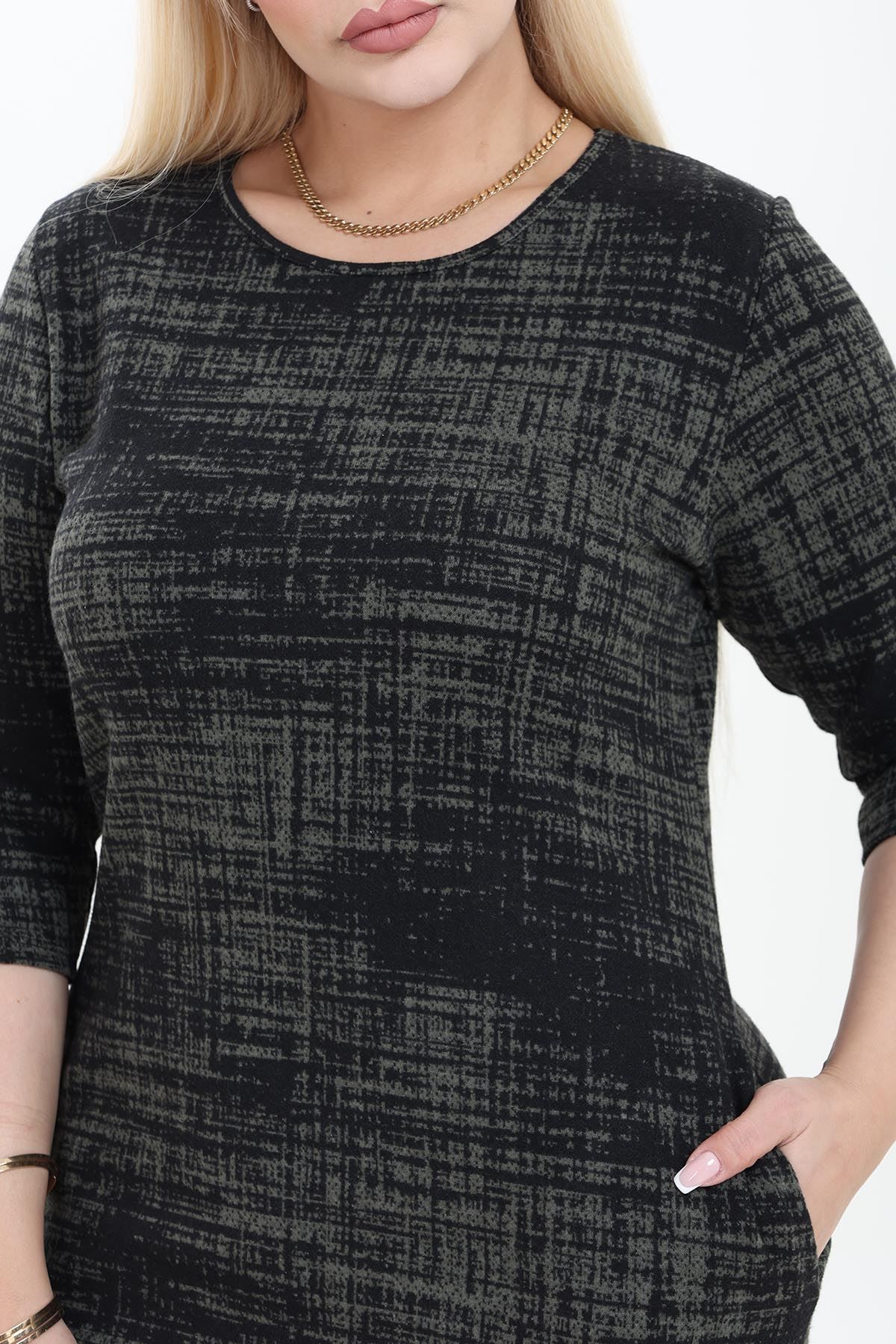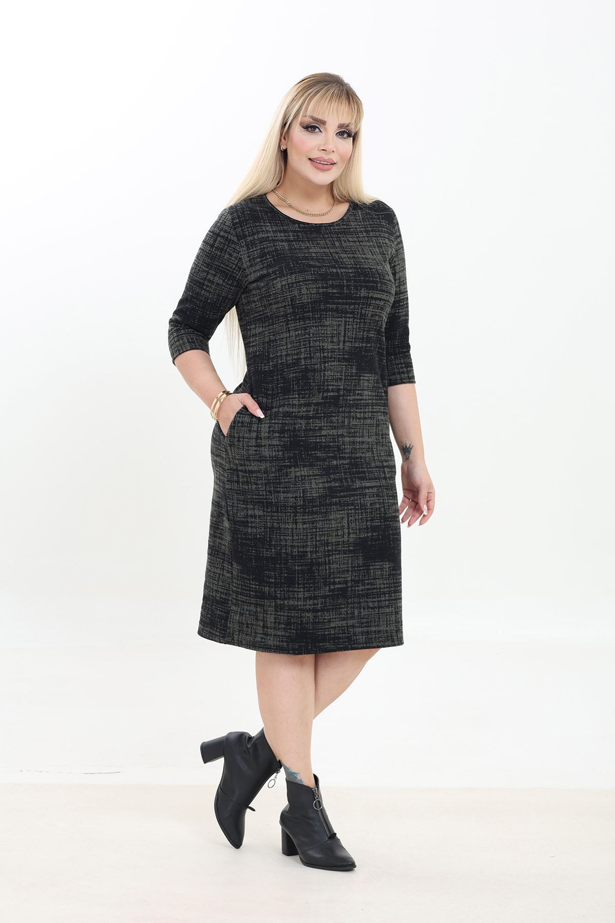 Çift Cepli Desenli Esnek Kışlık Büyük Beden Midi Elbise 38D-2752